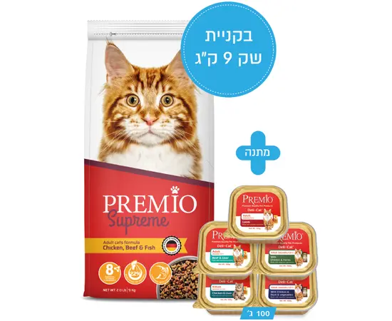 מבצע פרמיו מזון לחתולים 9 ק"ג + 5 מעדנים מתנה