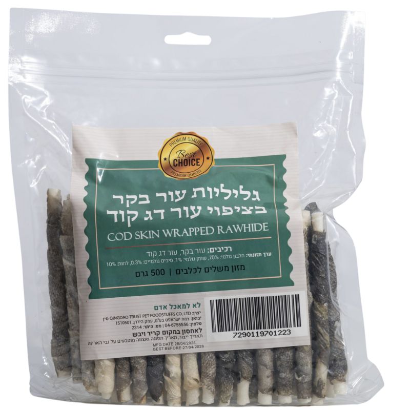 מתלהבים מפינוקים לכלב שלכם? חטיף גליליות עור בקר בדגם 500 ג'ר עם ציפוי דג קוד הוא הבחירה המושלמת לכל כלב! החטיף לא רק טעים אלא גם מספק יתרונות בריאותיים שמבטיחים את אושרם של חבריכם הפרוותיים.